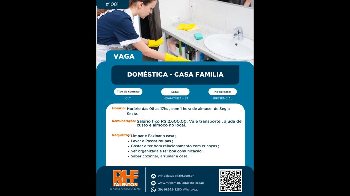 Experiência prévia em trabalho doméstico é altamente valorizada, mas não é um requisito absoluto.Se você tem habilidades de organização, é uma boa cozinheira e está procurando uma oportunidade de trabalho onde possa aplicar suas habilidades, esta pode ser a chance ideal para você.